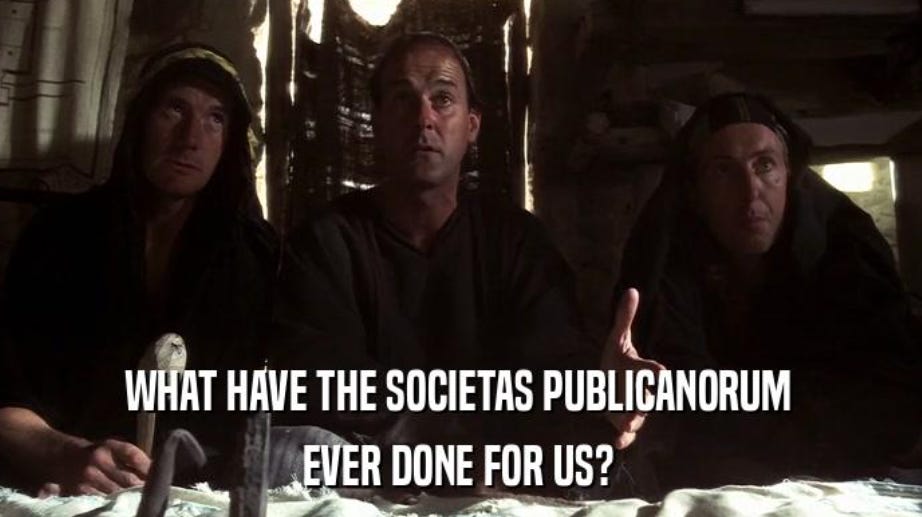 What have the societas publicanorum ever done for us? These where the organisations that collected taxes, managed government bueuracracy and organised great public works on behalf of The Republic.